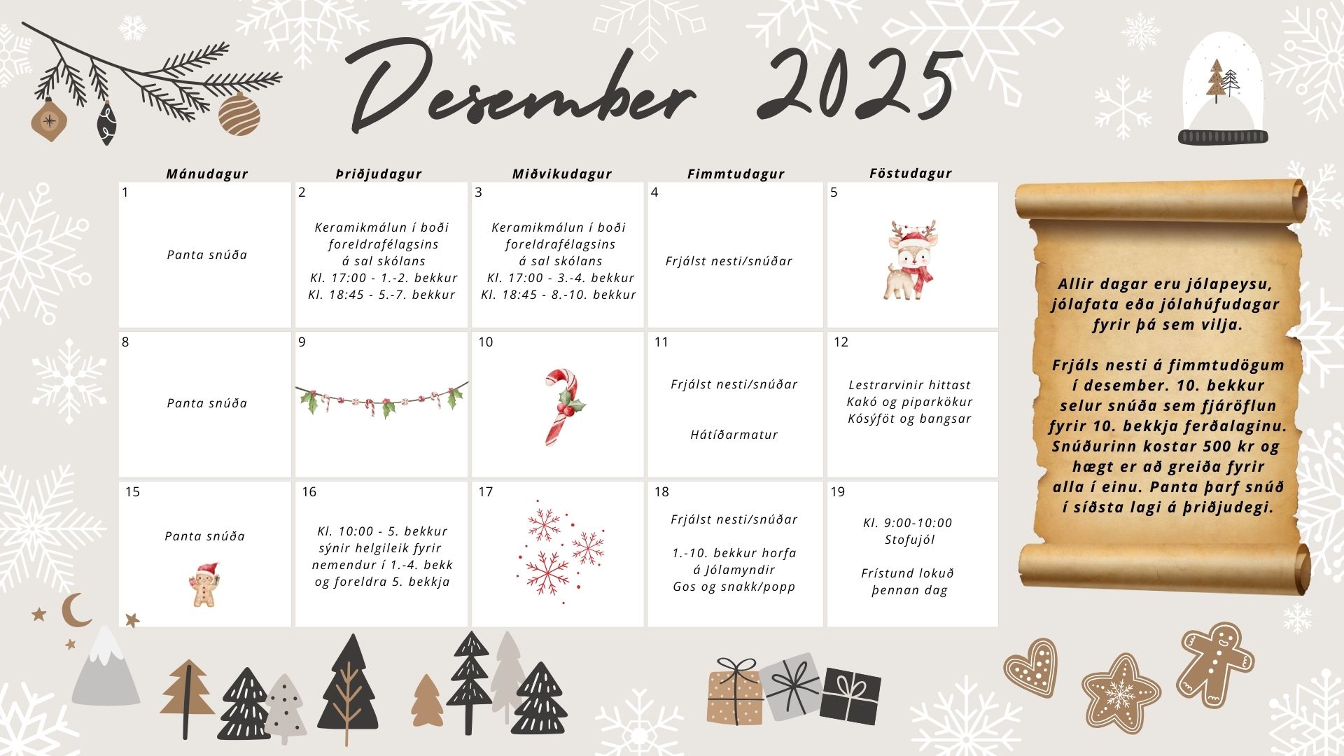 Hér má finna dagskrána okkar í desember, en hún er með hefðbundnu sniði. Lestrarvinir hittast, í boði verður heitt kakó og piparkökur, 5. bekkur sýnir helgileik í Hljómahöllinni og jólabíó er á sínum stað. Stofujól verða svo föstudaginn 19. desember.